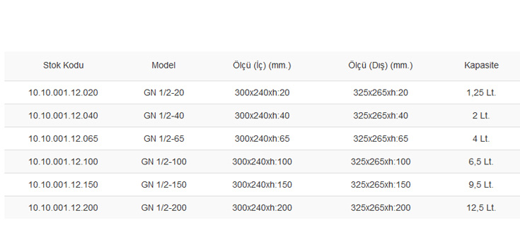 Sebze ve meyvelerinizi süzme amacıyla kullanabileceğiniz üründür. GN 2/1 model küvetler 650x530 mm ölçülerindedir. Yükseklikleri modellere göre değişmektedir.